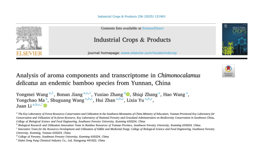 2025年9月,伟德国际victor1946李娟博士课题组在SCI一区TOP 期刊《Industrial Crops & Products》上发表了一篇题为“Analysis of aroma components and transcriptome in Chimonocalamus delicatus an endemic bamboo species from Yunnan, China”的文章,首次系统解析云南特有竹种——香竹的不同秆龄与部位的挥发性物质成分、合成途径及其调控网络,为其香味物质的开发与精油生产奠定理论基础,为香竹资源开发利用提供科学依据。