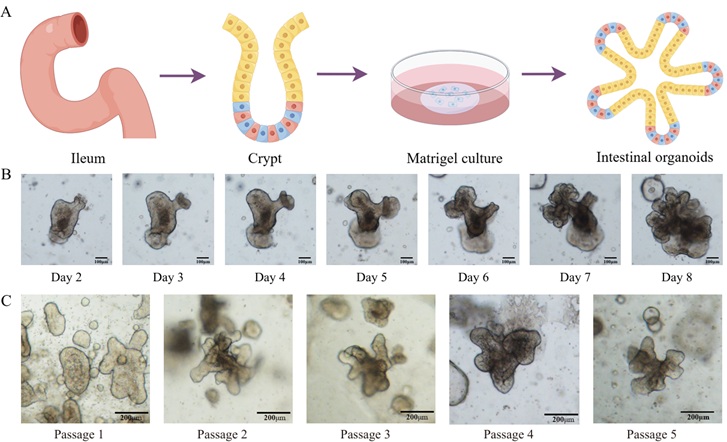 该研究首次建立了来源于小熊猫肠道干细胞的三维类器官培养模型。研究团队通过将回肠隐窝组织包埋于Matrigel基质中,成功构建了能够在体外长期培养、稳定传代及冷冻保存的小熊猫肠道类器官。进一步结合单细胞RNA测序(scRNA-seq)和转录组测序(RNA-seq)分析,系统评估了类器官与肠上皮组织在细胞组成和功能表达方面的一致性。研究结果表明,小熊猫肠道类器官具有多种肠上皮细胞以及肠上皮细胞的功能特征,为濒危动物肠道生理机制及相关疾病研究提供了重要的体外研究平台。
