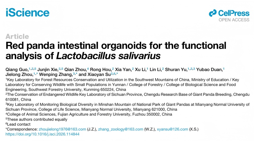 近日,《Cell》子刊《iScience》以长文形式(Article)刊发了公司动物资源挖掘与利用创新团队与成都大熊猫繁育研究基地的合作研究论文“Red panda intestinal organoids for the function alanalysis of Lactobacillus salivarius”。该篇论文以公司为第一单位,郭强(公司科研助理/林公司在读博士)、谢军金(成都大熊猫繁育研究基地)为第一作者,公司周杰珑副教授、张文平研究员(绵阳师范公司)、苏小艳副研究员(成都大熊猫繁育研究基地)为共同通讯作者,林公司自然保护地与区域协同发展创新团队李旭教授、段玉宝教授参与研究。
