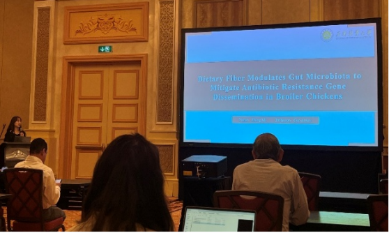 硕士研究生张咪作了题为“Dietary Fiber Modulates Gut Microbiota to Mitigate Antibiotic Resistance Gene Dissemination in Broiler Chickens”的学术报告。报告聚焦细菌耐药性问题,提出在肉鸡日粮中添加膳食纤维—菊粉,能够调节肠道微生物结构、抑制潜在致病菌,从而降低体内耐药基因的传播。该研究成果为减轻家禽生产中抗生素耐药基因的传播提供了有效的营养策略。基于其研究特色和成效,张咪同学荣获家禽科学协会研究生奖学金。